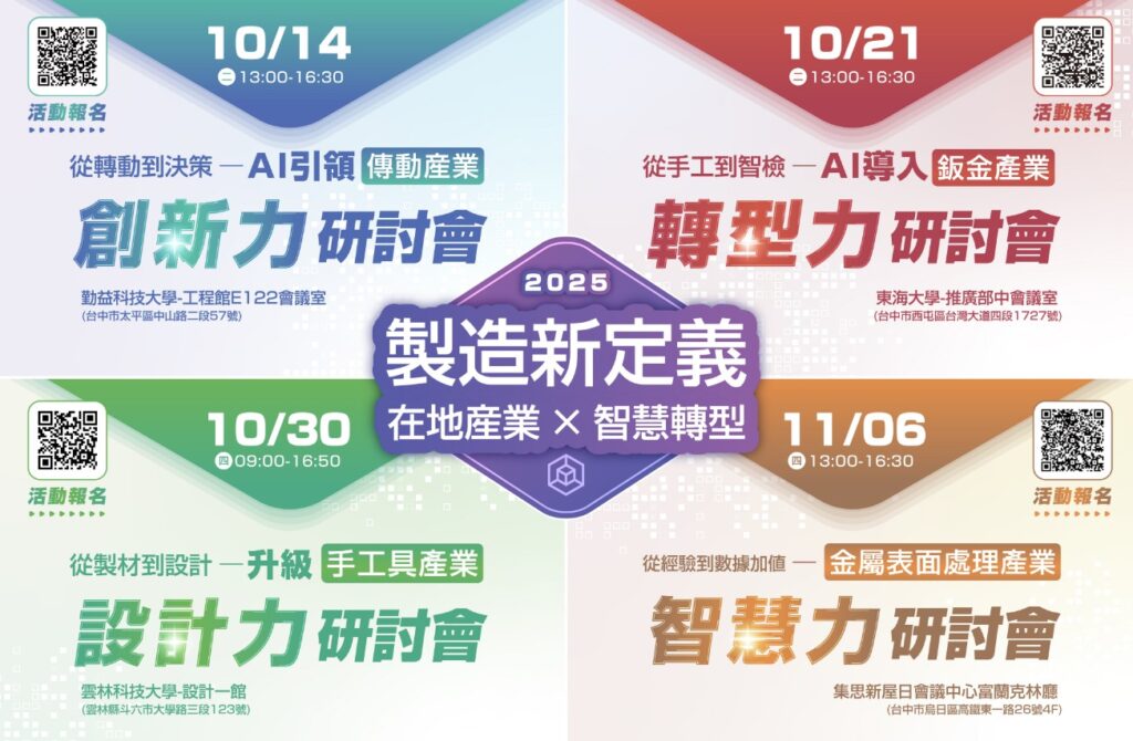 在地企業是臺灣經濟的磐石,也是支撐社會安定的重要骨幹。多年來,中小企業群聚的供應鏈模式孕育出無數隱形冠軍,如今更需要透過創新與智慧轉型迎接下一波挑戰。四場研討會將串聯政策、技術與市場,從痛點直擊到解方落地,為產業提供突破困境的實際路徑。誠摯邀請各界先進、企業與技術人員報名參與,共同推動在地產業邁向智慧與永續,攜手定義屬於臺灣的製造新未來。