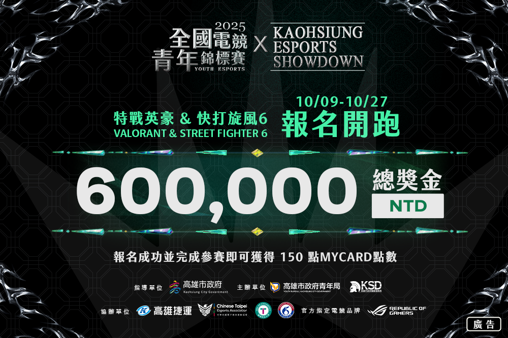 【高雄訊】由高雄市政府指導、青年局與運動發展局共同主辦,高雄捷運、中華民國電子競技運動協會、樹德科技大學及正修科技大學協辦的第五屆「全國電競青年錦標賽 x KAOHSIUNG ESPORTS SHOWDOWN」,將於(9)日正式開放報名。本屆賽事獲官方指定電競品牌「ROG 玩家共和國」贊助,競賽項目包括《特戰英豪》及《快打旋風6》,每項競賽皆開放256隊報名,參賽選手可獲得150點 MyCard 獎勵,歡迎全台電競好手齊聚高雄,爭取總獎金上看60萬元年度電競榮耀。
