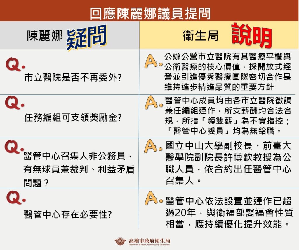 【高雄訊】有關(15)日陳麗娜議員於議會部門質詢時間關心市立醫院管理中心(以下簡稱「醫管中心」)相關議題,衛生局說明如下: