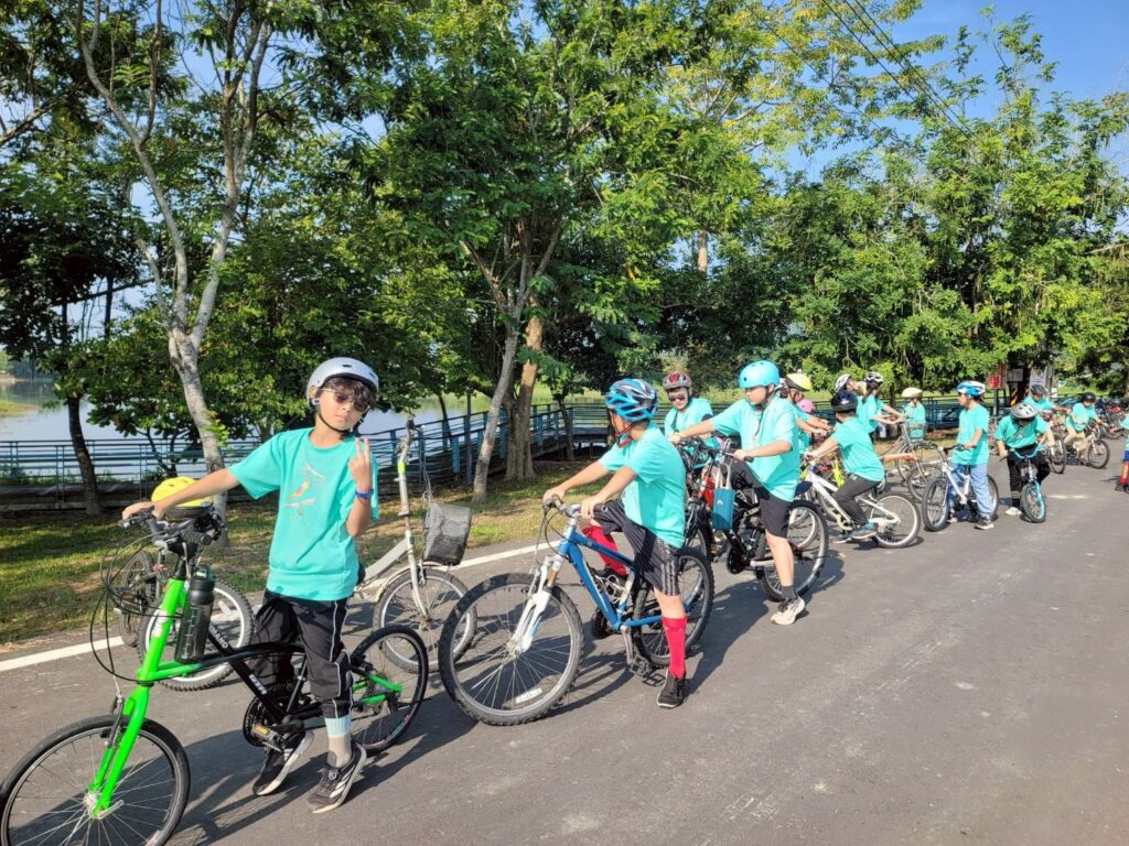 路線從本校前門出發,經開庄巷、民生路、東門冰果室左轉民族路,過新芳茶行後轉往客家文物館方向,沿途經美濃湖特色遊樂場至湖平台休息區,再沿著湖畔完成環湖體驗。全程約2.5公里,歷時約40分鐘,孩子們在藍天綠蔭間騎乘,學習辨識標誌、控制車距與安全停靠,親身體會安全駕駛的重要。 此次訓練不僅是單日活動,更是為學期末的「雙溪母樹林長程單車挑戰」做準備。