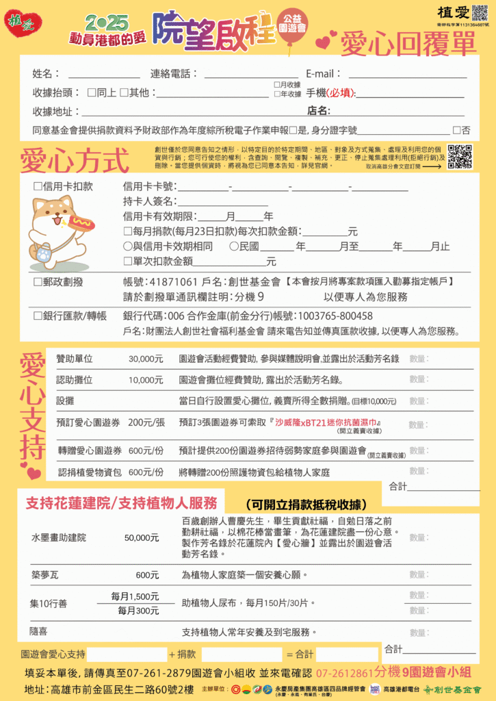 創世基金會提供清寒植物人專業照護近40年,秉持「救一個植物人,等於救一個家庭」理念,正籌建第18家清寒植物人安養院-花蓮分院,打造一處讓植物人安心安養的「家」。「院望啟程」公益園遊會,將於11月22日(六)上午10點半到下午4點,在高雄大遠百廣場盛大登場,盼社會大眾踴躍認助園遊券(一張200元),親自參與共襄善舉,或是二次公益,將園遊券轉贈弱勢家庭同樂,也可直接認捐植愛物資包(一份600元),分享愛給植物人家庭,串小愛成大愛。立即預訂園遊券(https://reurl.cc/rYN9nO);更多活動詳情,請洽「創世基金會高雄分會」臉書粉絲專頁或(07)261-2861#9園遊會小組。