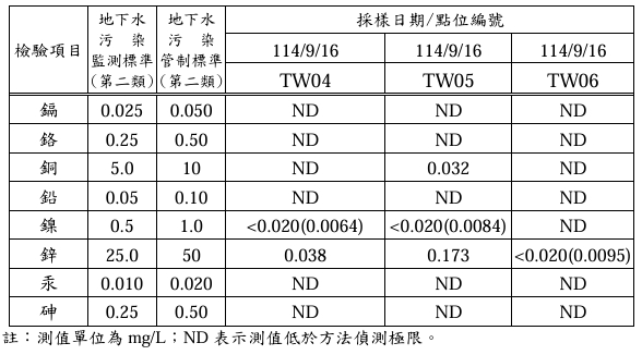 至於柯立委晚間發文稱,美濃坑洞下游溪埔寮民眾擔心水質受汙染,質疑環境部的監測井資料仍停留在一年前,環保局強調這是因為柯立委不了解,中央及地方主管機關皆會進行監測。環保局已於十月七日去函向立委陳菁徽說明過,當地地下水重金屬均低於管制及監測標準。根據今年9月新吉洋段附近採取三口民井地下水,檢測重金屬均低於汙染監測及管制標準,如附表所示,請柯委員不要混淆視聽。