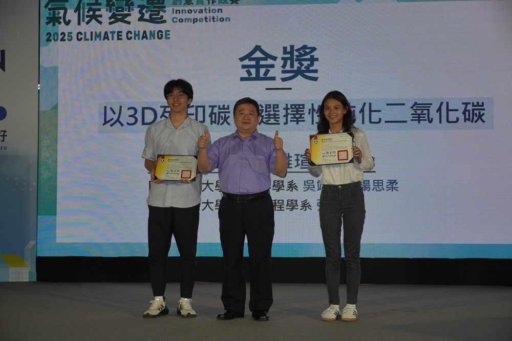 【台北訊】教育部(26)日於高雄駁二藝術特區「第五屆臺灣氣候行動博覽會」會場辦理114年度氣候變遷系列競賽頒獎典禮,頒發大專校院「氣候變遷創意實作競賽」、「高中職生AI淨零未來創造營成果展示競賽」獎項。其中國立臺灣大學及宜蘭大學團隊,以3D列印碳材,有效捕捉二氧化碳作為後續再利用或封存的作品,榮獲創意實作競賽「金獎」殊榮。
