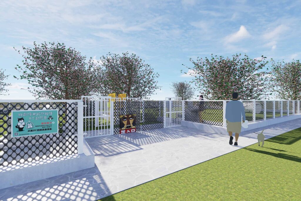 林園漁港公園位於濱海地帶,是當地居民日常運動與休憩的重要場所,每逢端午節更是龍舟競賽的熱鬧舞台,象徵著團結與協作的社區精神。此次新設的狗狗活動區,以「同舟×同行」為入口意象主題,融合狗狗划龍舟的創意設計,象徵毛孩與主人在人生旅程中彼此信任、共同前行。