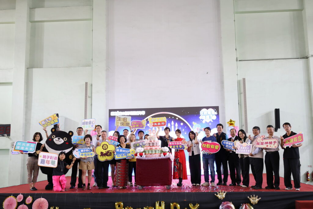 典禮高潮出現在三層造型生日蛋糕與「高雄熊」驚喜登場時,全場掌聲與歡呼聲不絕於耳,教育局張紋誠專門委員、市府陳佩汝參事、社教館黃昭誌館長、教育局家庭教育中心邱月櫻主任、小港區公所周益堂區長、小港高中薛鈺勤校長、青山國小張本文校長、小港國中柯章南顧問、漆彈推廣協會莊明樺理事長、印尼姐妹會陳雪娥會長、御爐香豆花顏麗容會長、懿品乳酪菓子手造所周志鴻老師、高雄市小草關懷協會林菀芃主任、歐姐滷蛋歐秋琴女士、陳榮哲先生、金美網購企業有限公司蘇彥綸先生、鄭佳慧女士、威齊織品科技有限公司李紫菱總經理、楊粧仁副總經理、賴瑞隆立法委員服務處曾文涼主任、鄭光峰議員、陳麗娜議員、李順進議員服務處柯明昌副主任、曾麗燕議員辦公室周宏燊主任、吳銘賜議員服務處謝宗蒼助理、前議員陳致中服務處蕭丞堯主任、議員參選人黃雍琇女士與大小朋友齊聲高唱生日快樂歌,為社教館遷址30週年獻上誠摯祝福。特別的是,這座獨一無二的造型蛋糕,是館方精心構思,運用印有「新館徽」的棒棒杯巧手打造而成,「新館徽」象徵著社教館邁向嶄新旅程,開啟下一段璀璨篇章。