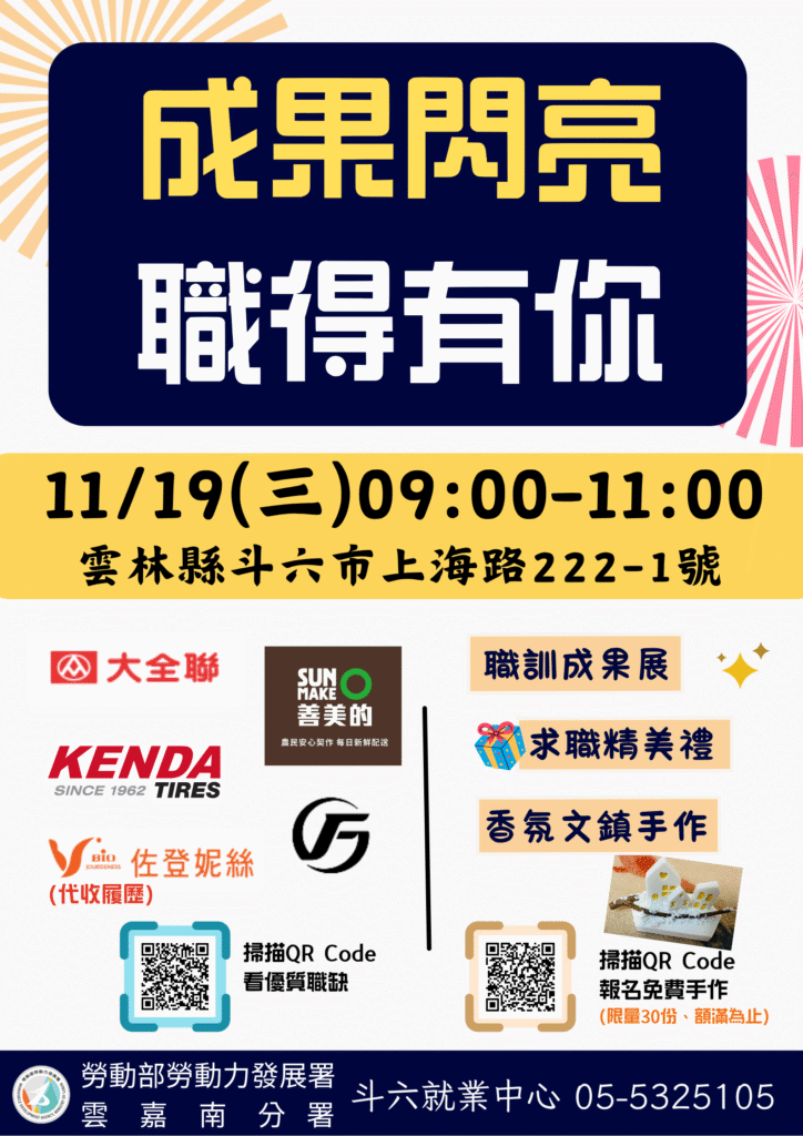 斗六就業中心11/19徵才暨職訓成果展 現場手作體驗及求職好禮獎不完