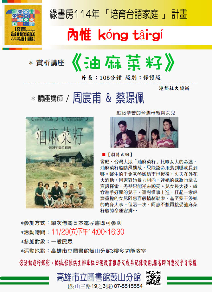 11月29日下午14時起 鼓山電影院 賞析講座-台語電影《油麻菜籽》 家庭與女性生命成長覺醒