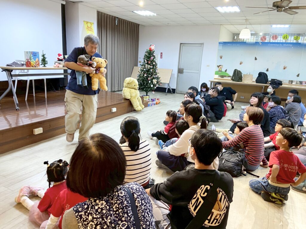 另一主場是說故事達人-胖叔叔,胖叔叔為幼兒園的耶誕親子活動,帶來《不一樣的聖誕禮物》和《小熊兒的秘密》繪本故事,孩子年紀雖小,看著胖叔叔生動活潑的說故事表演,也跟著進入了胖叔叔的繪本世界,感受到節慶的溫馨及分享的氛圍,並且鼓勵孩子探索世界。