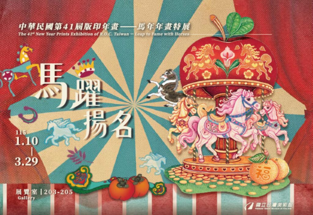 二、國立臺灣美術館推出「馬躍揚名-馬年年畫特展」,共計90件獲獎作品展出。特別邀請藝術家林仁信與謝鴻均創作〈金馬奔騰〉、〈羽隱〉兩件委託作品。
