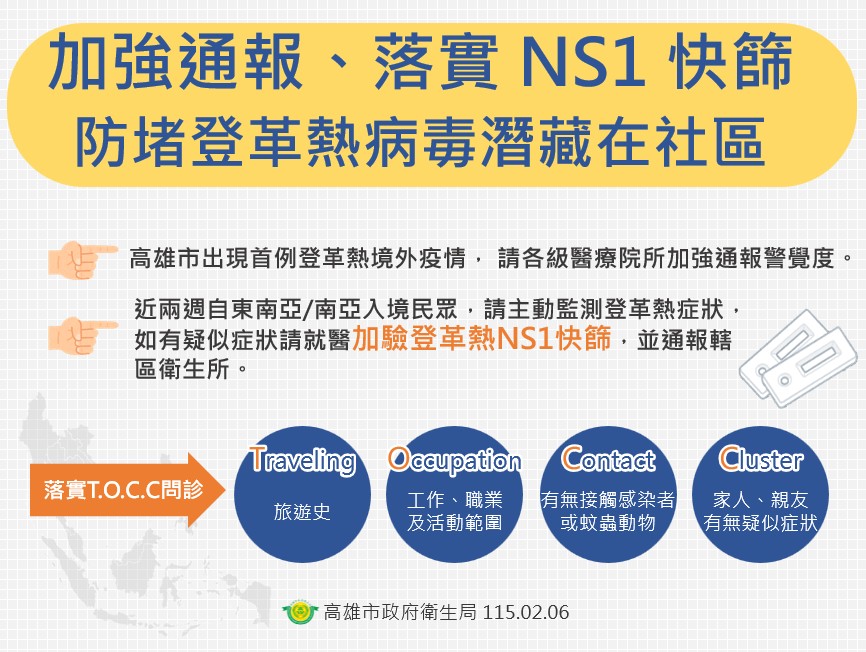 【高雄訊】高雄市衛生局(6)日公布今(115)年首例登革熱境外移入確定病例,個案為50多歲本國籍男性,長期在印尼工作,因農曆春節於2月3日返國,個案於1月31日在印尼時即有發燒、肌肉痠痛症狀,曾自行服用感冒藥,返國後因身體仍不適,2月4日就醫,抽血檢驗登革熱NS1快篩陽性,2月5日PCR陽性確診,現正住院治療中,市府防疫團隊已動員進行相關防治工作。