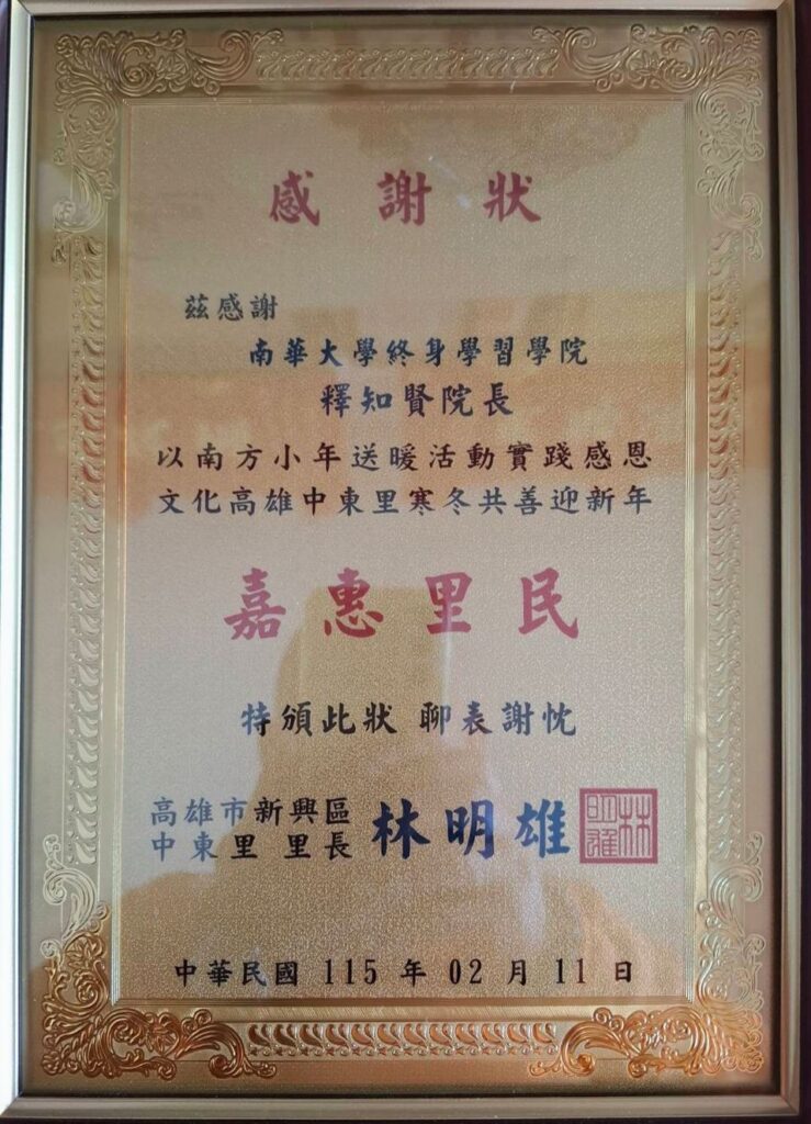 值得一提的是,參與此次行動的學界與企業代表,長年以實際行動回饋社會,將感恩落實於具體實踐之中。釋知賢院長曾於母難日隨喜捐助新臺幣一萬元,支持高雄六龜區新威國小圖書館建置,為偏鄉孩子打造更穩定的閱讀與學習環境;企業界代表亦多年來於母難日持續關懷弱勢家庭,展現「受助而後回饋、得力而願付出」的正向循環。