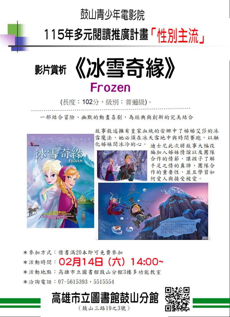 02月14日下午14時起 鼓山青少年電影院 冰雪奇緣影像欣賞會