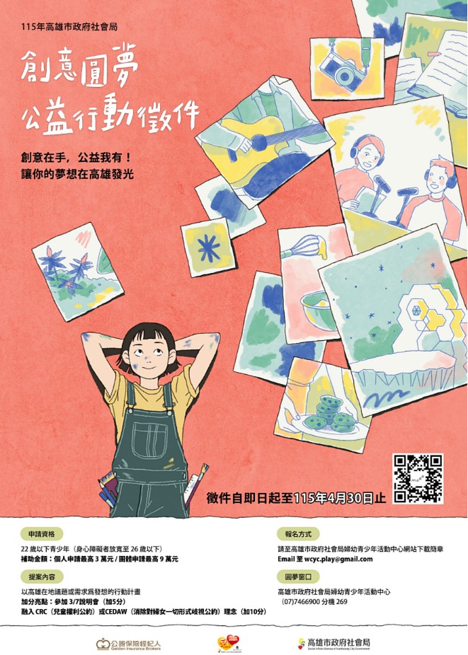 【高雄訊】一個單純的念頭,就能成為改變社會的起點!高雄市政府社會局115年「創意圓夢.公益行動」徵件活動即日起正式開跑,邀請青少年勇於發想,為高雄在地議題提出有創意的解決方案。